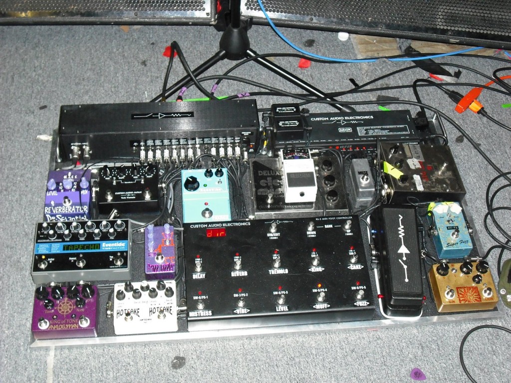 One of the guitarists I’ve liked for years is J. Mascis and I was curious what his pedal board was like. I found a recent post (dated 4/18/2009) which included a link to a photo of it. I have that photo below. I thought it would be fun to ID some of the pedals. Pick a pedal and ID it in the comments below.