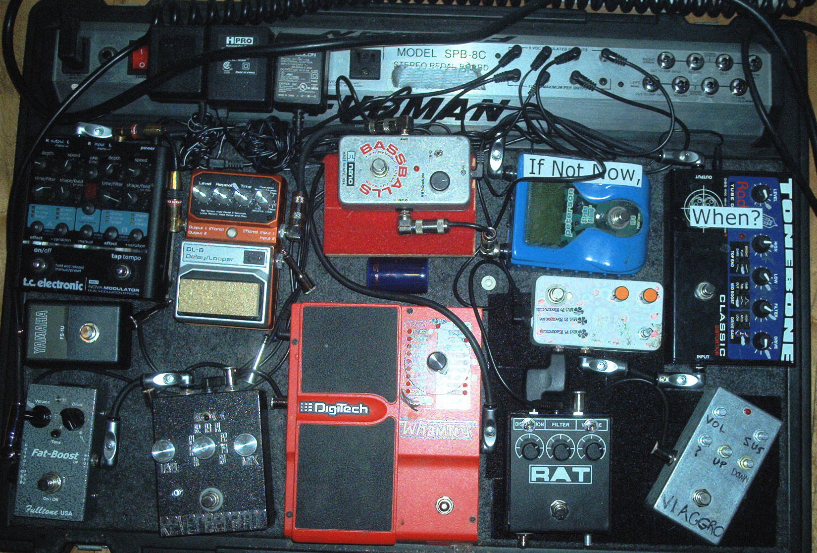 Signal Flow: BYOC 5-Knob Compressor> Paul Trombetta-Modded Rat*> Mid-Fi Glitch Computer> Radial Tonebone Classic> Peterson Strobo-Stomp> EHX Bassballs> Digitech Hardwire Delay> TC Electonics Nova Modulator> Digitech Whammy> Dr. Scientist Reverberator> Fulltone Fat-Boost (+ Yamaha Channel Switcher)