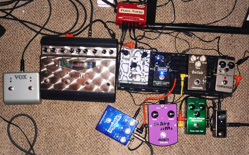 One of the things I’ve learned that will really help preserve and enhance your signal through long pedal chains is to always run a buffer on both ends of your chain. I use the EP Booster up front to push and boost clarity. And I use the Tube Replex at the end as sort of an always on tube buffer. Believe me, if you heard the Tube Replex you’d want to leave it on all the time too.