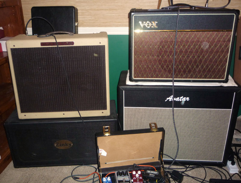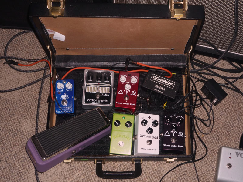 Of course it’s obvious that I love delays and chorus/vibe effects. But I’m also a fuzz freak as you can see from the picture of the pedal case full of muffs and fuzzes and wahs (Oh my!) that didn’t make the cut on this new stereo line-up.