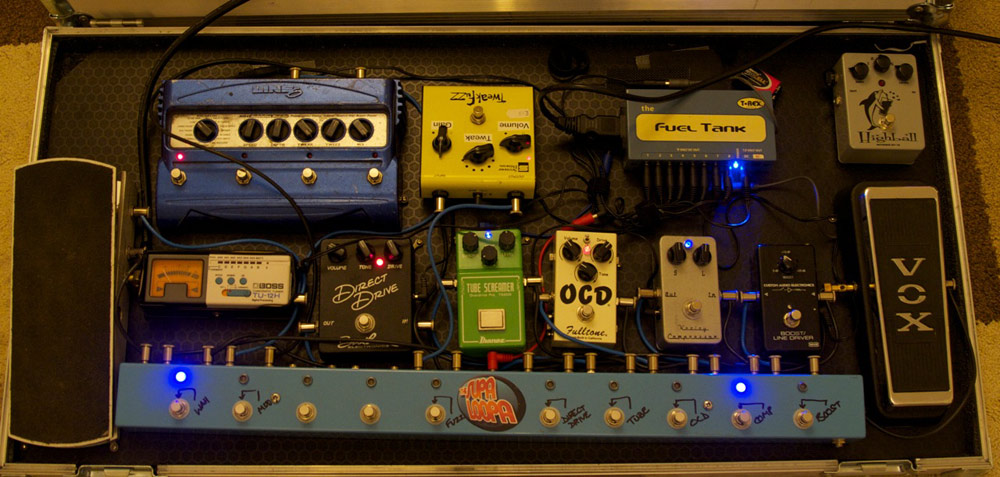 Today’s pedal line is from Tony Rawson. If you have a pedal line (doesn’t have to be in a board) for your rig, please email me a photo, bio, description of pedals and routing to pedalline@nulleffectsbay.com. Every Friday I’ll showcase a pedal line submission. Make sure you include any links to your band or music page.