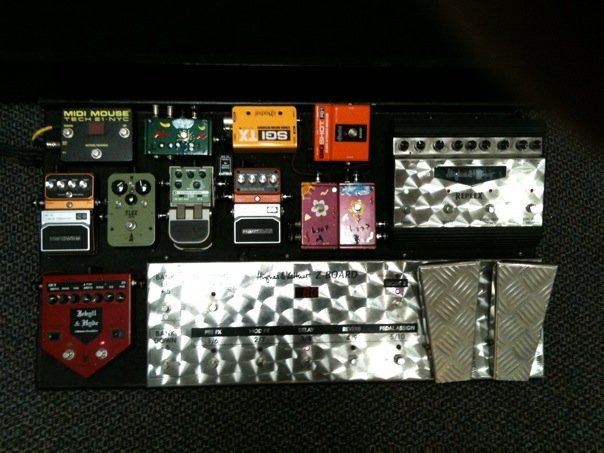 Digitech Hardwire Distortion, Visual Sound Jekyll & Hyde, Tech 21 MIDI Switcher, Custom Loop Box, Rockett Flex Drive, Line 6 Echo Park, GigRig Virtual Battery, Digitech Hardwire Delay, Custom Loop Box, Radial SGI & PB-1, Hughes & Kettner Zentera Controller, Hughes & Kettner Replex Delay