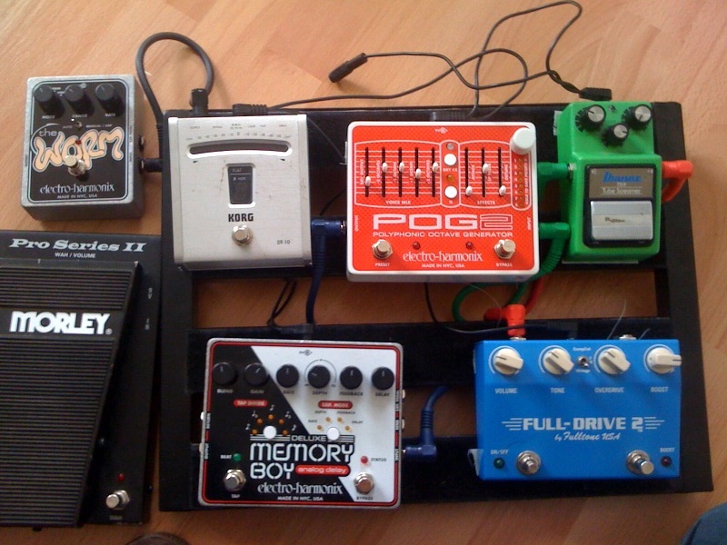 This is my current setup: Guitar > Fulltone fulldrive 2 > Ibanez tubescreamer analog man > Electro Harmonix Pog2 > Electro harmonix memory boy deluxe > Morley Wah > Electro harmonix Worm > Korg tuner DT-10