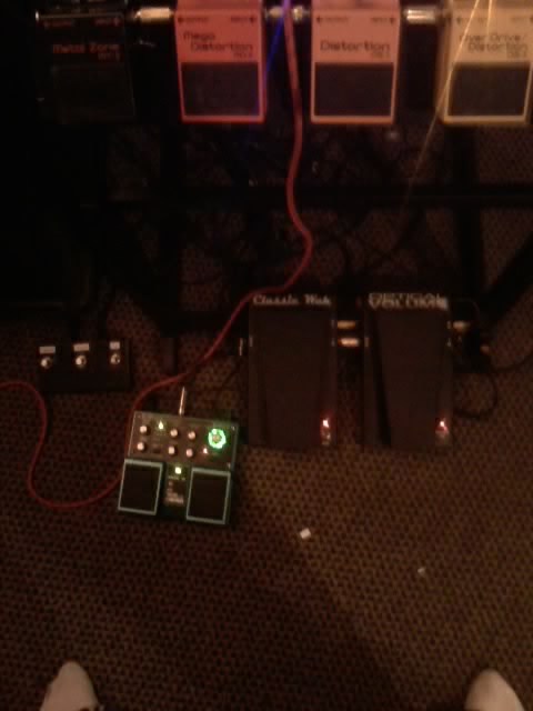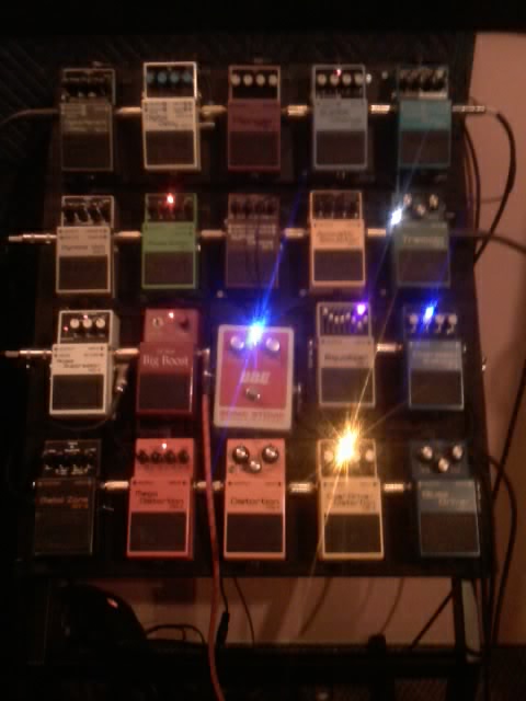 Okay lets break these pedals down and show whats happening in my set-up! If you want to know what has been done to each modded pedal, please contact Rick! He will be more then happy to work with anyone with an interest. I will start from guitar and go to the back of the amp: I start out by going into a boost/buffer that was built into an old Boss pedal. Rick named it a Lil Bear, Big Boost! (I painted it candy apple red!) From there I go down onto the floor and go through a Morley volume and a Morley wah. That way I have a buffer in front of those pedal! Then it jumps over to a Boss SL-20 slicer pedal. I then move up to the board and into the input of an NS-2 noise suppressor. (I will just give Boss model numbers from this point) In the loop of the NS-2 I start my distortion chain. First is a BBE sonic stomp, (a must have item) into a GE-7 EQ pedal (modded), into a CS-3 compressor pedal(modded) into a BD-2(modded) I then go into a OS-2 overdrive(modded) to a DS-1(triple modded) into a MD-2 mega distortion(un-modded) to an MT-2 that is also modded. All this goes into the front input of my amp!