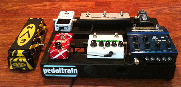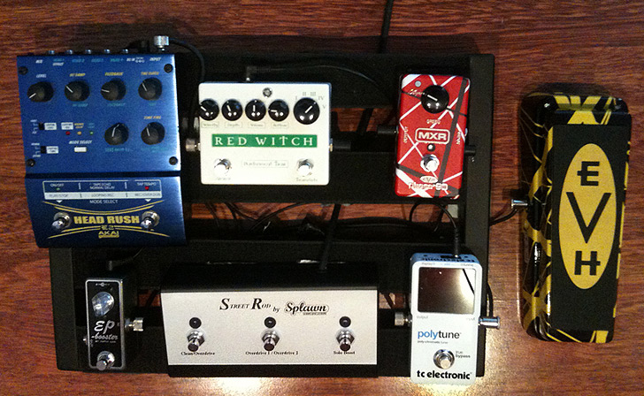 After years of having pedalboards the size of small cities, I’ve recently slimmed it down to a very small Pedaltrain Jr board running the following: TC Electronics Polytune, Dunlop EVH Wah, Xotix EP Booster, MXR EVH Phase 90, Red Witch Pentavocal Trem and an Akai Headrush E2.  Also on the board is the channel switch/solo boost pedal for my amp (Splawn Street Rod head, which I run into a Mesa Boogie Recto 2×12 cabinet).  Power is supplied by a Voodoo Labs Pedal Power 2+.  The Wah, Tuner and EP Booster go into the front of the amp, and the Phase, Trem and Delay go through the amp’s effects loop.