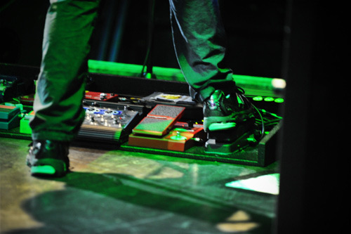 Here are some shots of later views of the pedal board including the Digitech Whammy and Lehle switch. I’m still unsure about the large box in the center (looks like 2 power supplies) and the single switch box with the star at the top. I’m guessing it might be a kill switch when swapping guitars. It doesn’t appear to be connected in the top photo, and I’m not seeing it on other shots.