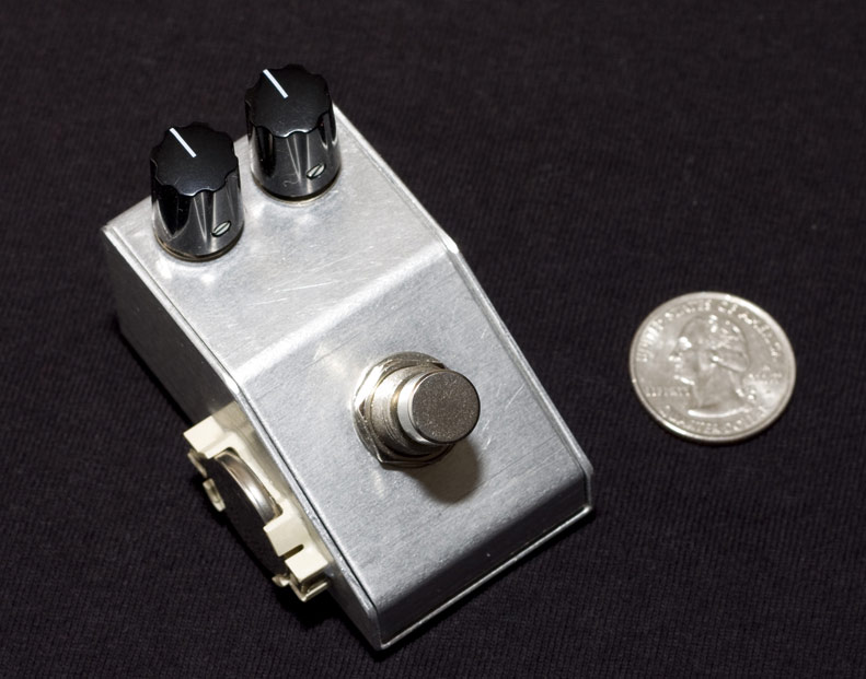 I received the pedal in the mail from TONEbUTCHeR (out of Costa Mesa, CA) and was immediately surprised by it’s size. It’s TINY! We’re talking 2.6″ long, 1.5″ wide and 2″ tall with the knobs. You literally can put this in your pocket. It’s powered by a little 3V battery mounted on the side of the pedal. The unit has two knobs (non labeled), I’m assuming one is level and the other is gain.