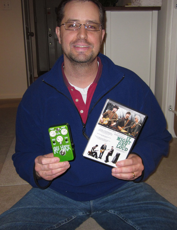 In February, Mike Kabatt won the VFE Pale Horse Dynamic Overdrive give away. We were stoked to be able to test drive the VFE Pale Horse (Thanks much Peter), and it was great to give it away to a lucky winner. Here is a shot of Mike with his bonus prize – It Might Get Loud DVD. I had fun giving away something extra, might continue that tradition in the future.