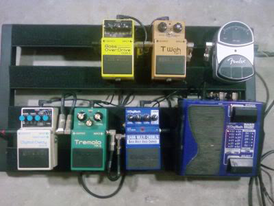 Today’s pedal line is from Clarence L. Mayhew. If you have a pedal line (doesn’t have to be in a board) for your rig, please email me a photo, bio, description of pedals and routing to pedalline@nulleffectsbay.com. Every Friday I’ll showcase a pedal line submission. Make sure you include any links to your band or music page.