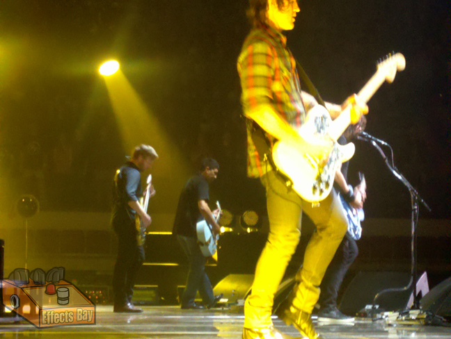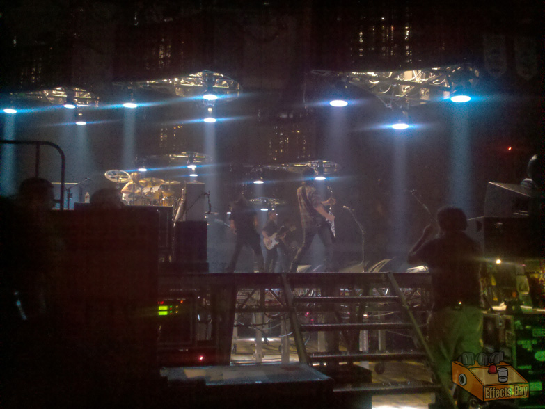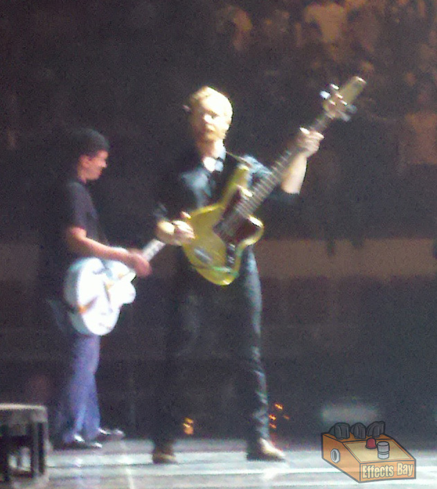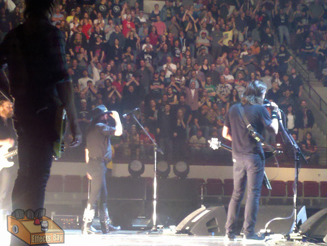 The set was amazing! Foo Fighters played for 3 hours straight! Energy level was crazy high, and they were humming on all cylinders. Before the show, I had a chance to join in on a conversation about necks, pickups and guitars with Chris Shiflett, unfortunately he had to get ready for the show before we could talk about effects. I did have a few words with Nate about effects though. He mentioned that he does use a Fulltone Bass drive for some overdrive parts, but since he’s dealing with a 5 piece band, that playing straight is often the best choice tonally for the band.