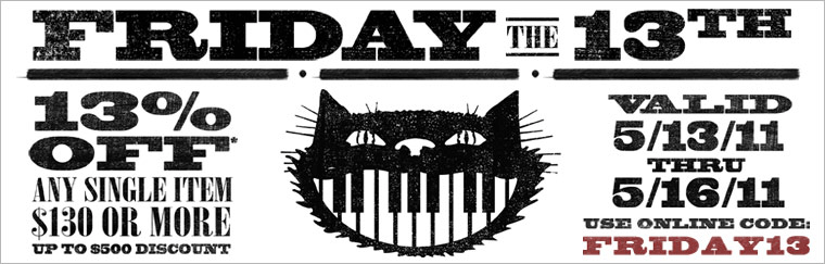 Guitar Center is launching a new coupon code campaign today – for Friday the 13th. The coupon takes 13% off of a single item over $130.00 (maximum discount is $500). The offer starts today (5/13) and is active until 5/16. At checkout simply use the following coupon code: FRIDAY13! <= I’m not sure if the ‘!’ is suppose to be there, but it almost appears that you do. If you use the code, can someone confirm this for me and I’ll update the post. Click here for full details on the coupon.