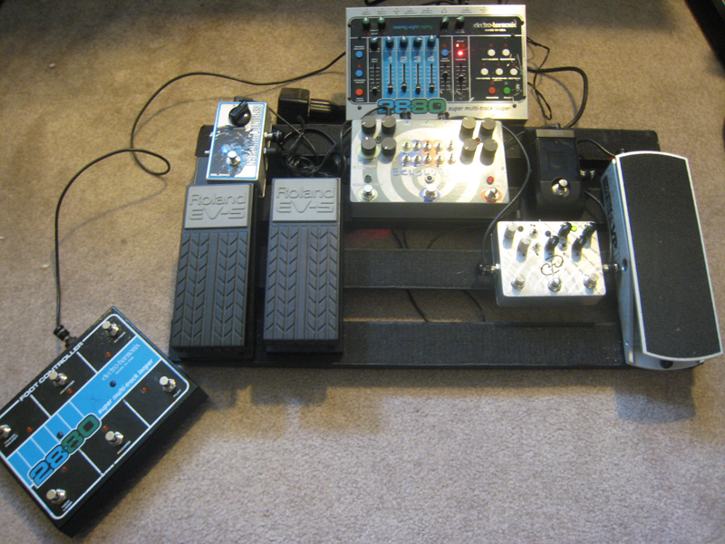 I’m running a pretty simple setup these days that includes: Pedaltrain 2 pedalboard with Voodoo Lab Pedal Power 2 plus power supply, Ernie Ball VP Jr. Volume Pedal > Korg Pitchblack Tuner > Paul Trombetta Design FeederBoneMachine-Fuzz/Feedback/Distortion > Pigtronix Echolution-Delay > Malekko Spring Chicken-Reverb > Electro Harmonix 2880-Looper with footcontrol > out to amp. There are also 2 Boss EV-5 expression pedals to control the delay time in the Echolution and the other to control reverb level in the Spring Chicken.