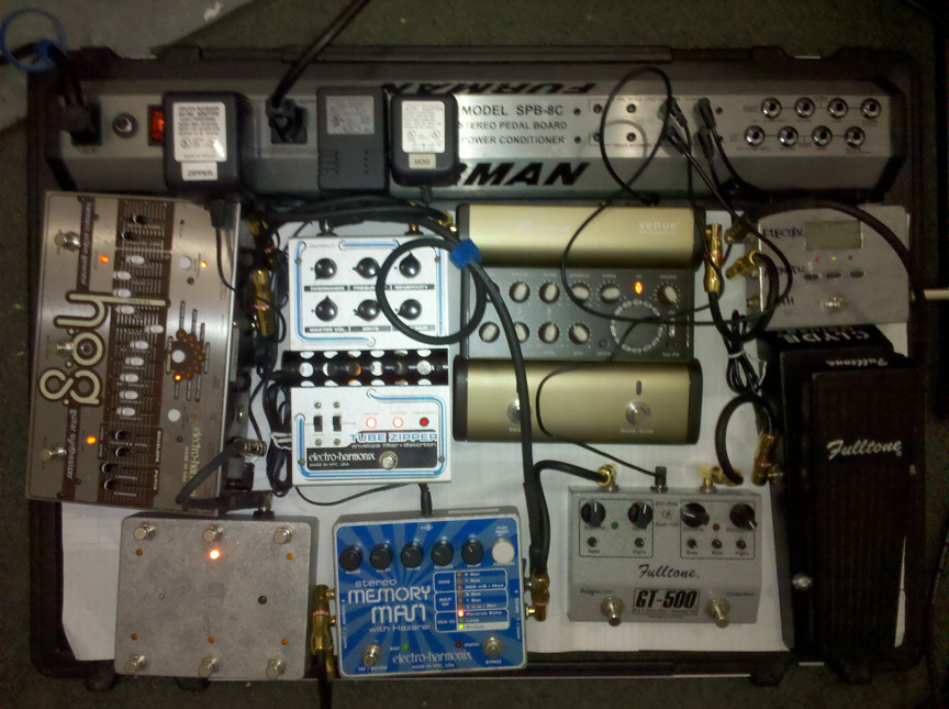 In 2008, I started putting together my pedalboard for live shows with Ghost Ghost. I knew several things from the very beginning, before I spent any money. First, I knew I would need many different kinds of delay. Second, I knew I would need many different distortion options. Third, I knew that fast setup would be essential for live shows in NYC rock clubs, where setup time between acts is frequently 15 minutes (if that).