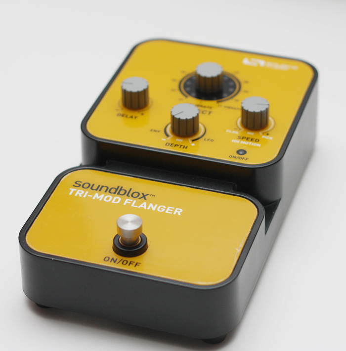 Okay, let’s talk about the Soundblox Tri-Mod Flanger. The Tri-Mod Flanger came from the original Hot Hand Phaser/Flanger system in a smaller system. The tri-mod flanger has 11 preset ‘effects’. The presets include: