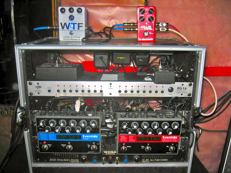 A wussy band was scared by this rig, which they referred to as “The Doomsday Device.”  It is a bit of a drag to transport, but for all the hassle one endures playing original music, who cares about that? It is very reliable, and quick and easy to set up, which most find surprising. Also easy to use onstage– I don’t spend much time tweaking tones at all, other than adjusting for room acoustics, which is done on the amp channels.