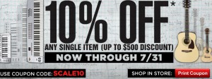 I just received a email from Guitar Center letting me know they’re having a 10 day 10% sale going on. Offer expires 7/31/11. You can save 10% off any single item (up to $500 discount). Simply use the following code at check out: SCALE10
