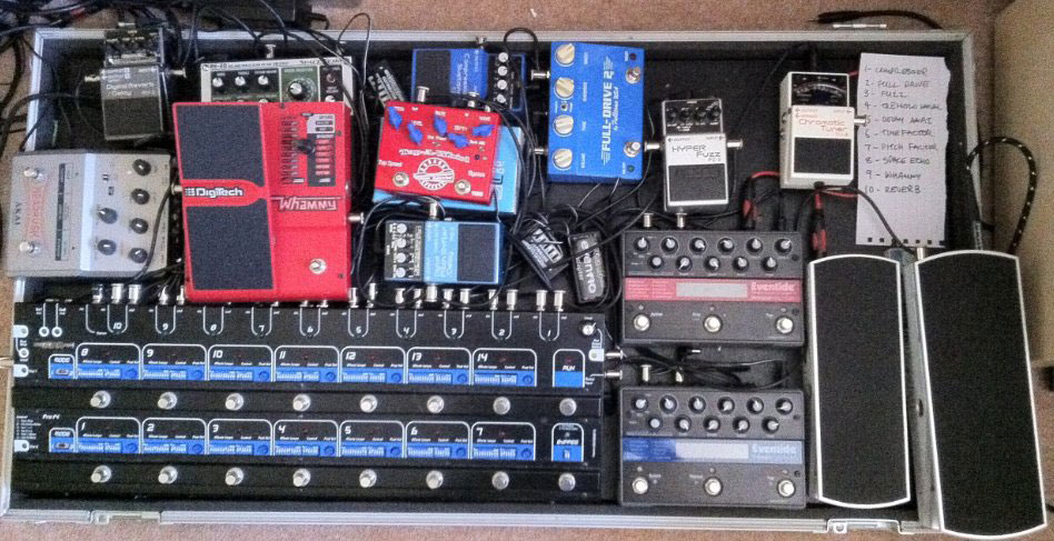 Today’s pedal line is from Jonathan Holloway. If you have a pedal line (doesn’t have to be in a board) for your rig, please email me a photo, bio, description of pedals and routing to pedalline@nulleffectsbay.com. Every Friday I’ll showcase a pedal line submission. Make sure you include any links to your band or music page.