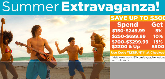 Next we have the Summer Extravaganza sale at Music 123 where you can save up to $500. This is tiered savings. Here is the break down on savings: