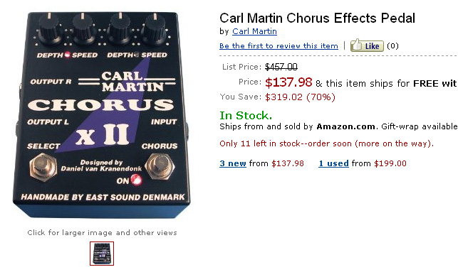 Here is another one of those amazing deals on Carl Martin pedals currently going on at Amazon. This time it’s the Carl Martin Chorus xII. This pedal lists for $457.00, and is usually available for $319, but is currently on sale for only $137.98!! At the time of this posting there were only 11 in stock. Just like past deals, when the inventory gets down to one or two, the price will probably jump up to $300 range. This pedal is also eligible for FREE Super Saver Shipping. This is a chance to pick up a great pedal for a unbelievable price!