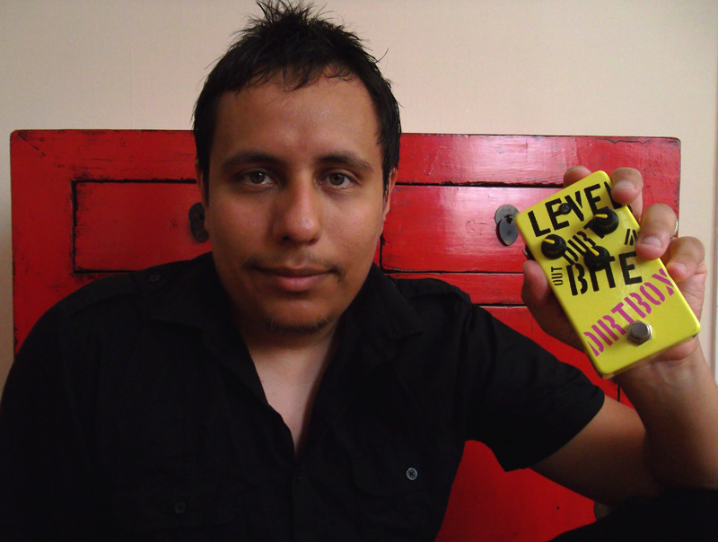 The last give away I put on was for the Coopersonic Dirtbox. A great pedal from Coopersonic Engineering. If you’re unfamiliar with it, please check out our demo (“Demo of the Coopersonic Dirtbox“) and also visit Coopersonic on the web! The winner from that give away was Celeste from California. She was kind enough to send me a photo of her husband (who she gave the pedal too) with his Coopersonic Dirtbox.