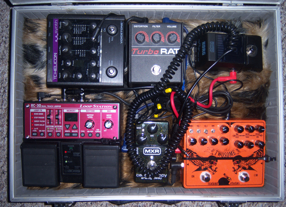 I play guitar with backing vocals for Stone Giant. We are a Vancouver Island Slug Rock band. I can’t provide you with audio samples… sorry. I plug my Les Paul into the awesome and powerful Twosome by Blackout Effectors, which is really two pedals. One; their Fix’d Fuzz with an outstanding retro feel and the Musket, furious distortion. Then to a Korg tuner. I used to go into the tuner first but it’s such a tight fit into the pedal case I would have to unplug the Twosome each time. I mostly use the tuner as an audio cut off anyway. From there we continue our voyage into the Analog MXR Delay. The Modulation button will change your life. Next is for more subtle distortion, Turbo Rat. I use this mostly for looping rhythm. Now, the Looper; Boss Loop Station RC-30 with enough recording time to record a whole set plus two more. That feeds into my Marshall AVT-2000. It’s not the most popular head, but it is with me. The sound, mixed with these pedals are bodacious. That feeds into a Line 6 4×12 cab. That other pedal you see is only on the board in storage. When set up it sits next to the board but is wired into the Loop Station and out to a PA. It’s the best vocal effects combo. I think TC Helicon is breaking their line into single pedals now.