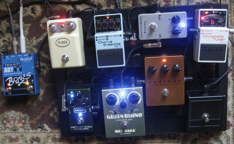 guitar/lap steel > Boss TU-2 tuner > Hartman Vintage Germanium Fuzz > Way Huge Green Rhino overdrive > MXR Carbon Copy delay > Keeley compressor > Boss CE-5 chorus > T-Rex Tonebug reverb > Radial ABY amp switcher > Silvertone 1421 (10 XL) and/or Vox Pathfinder 15