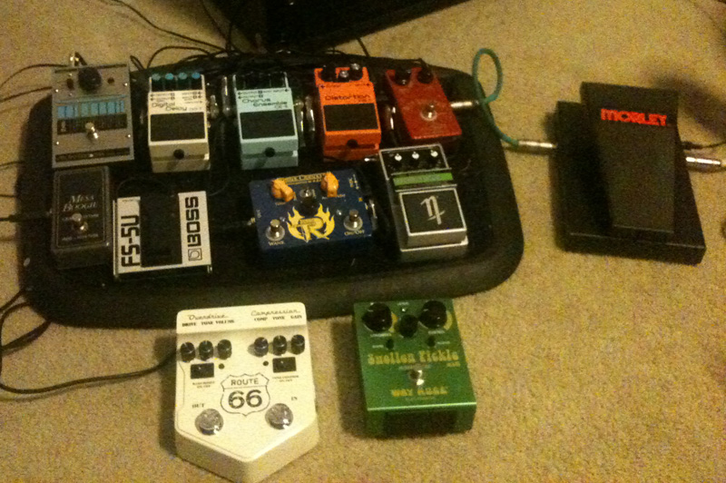 Today’s pedal line is from Jason McGuffin. If you have a pedal line (doesn’t have to be in a board) for your rig, please email me a photo, bio, description of pedals and routing to pedalline@nulleffectsbay.com. Every Friday I’ll showcase a pedal line submission. Make sure you include any links to your band or music page.