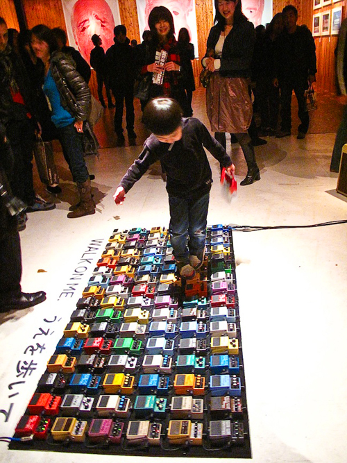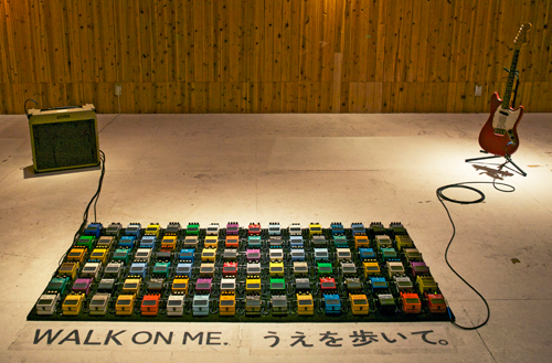 I just stumbled across this interesting art installation by David Byrne (I first discovered this on Walrus Audio’s Facebook page). It’s an interesting art installation of 96 Boss pedals in a grid and all wired in series, with a RC-3 loopstation as the first pedal to provide a simple loop signal to the rest. Participants can walk on the pedals creating their own sonic result.