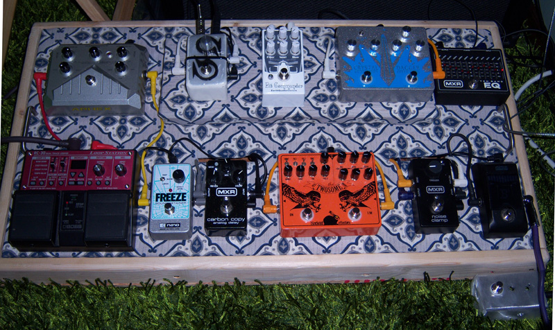 Today’s pedal line is from Richard Western. If you have a pedal line (doesn’t have to be in a board) for your rig, please email me a photo, bio, description of pedals and routing to pedalline@nulleffectsbay.com. Every Friday I’ll showcase a pedal line submission. Make sure you include any links to your band or music page.