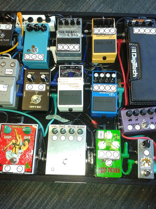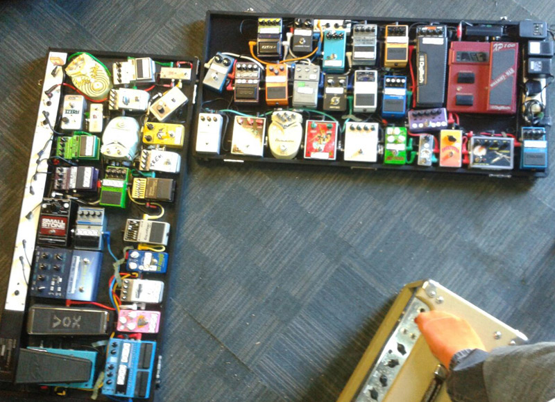 My name is Richard Memczak. I play guitar in a couple of bands in the UK, Only Twin and Eyechild. I love guitars, and have a fairly excessive collection, and i’m a little obsessive. I played in a function band for a few years recently, until Only Twin started getting sorted out, so i needed a fair amount of pedals for the function band, but as Only Twin became quite experimental and i became more obsessed with collecting, i started buying more. And the result is what you see here. No less than 49 pedals in my board(s) right now, and then i’ve got a few more lying around the house too… So! Here’s a bit of a rundown of gear.