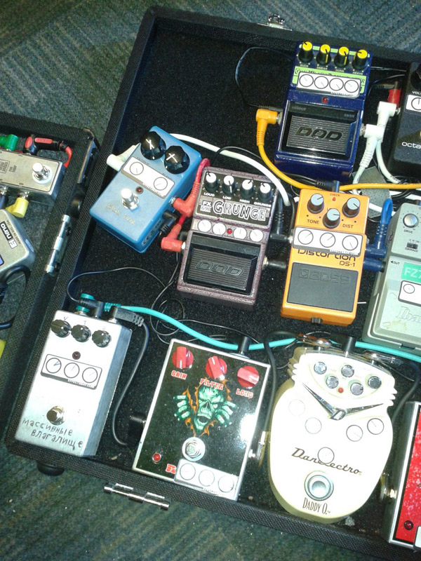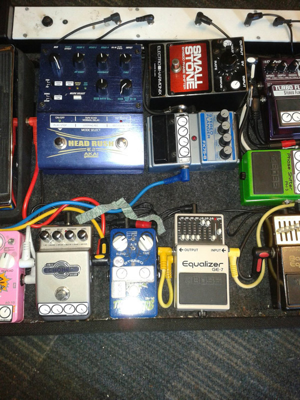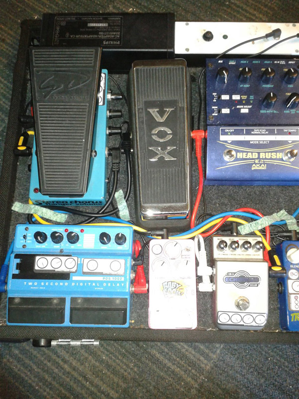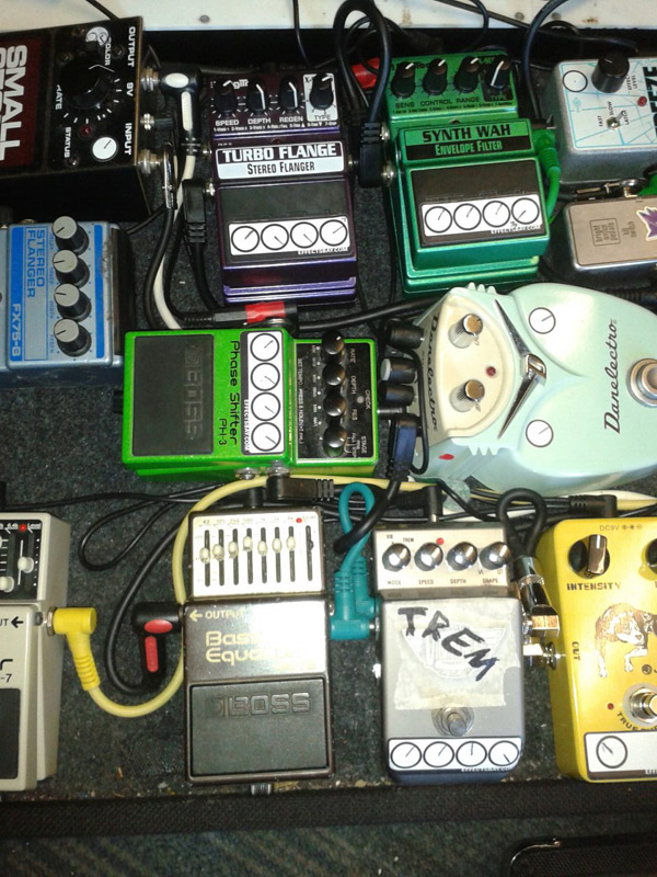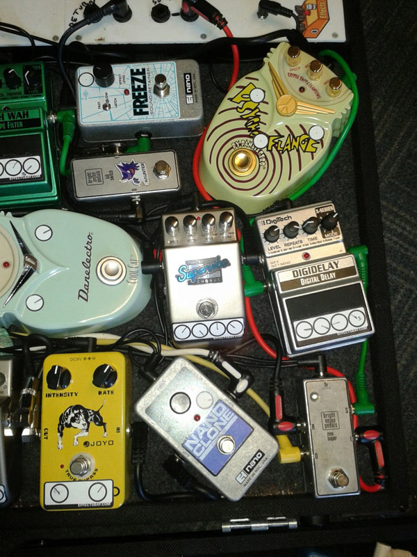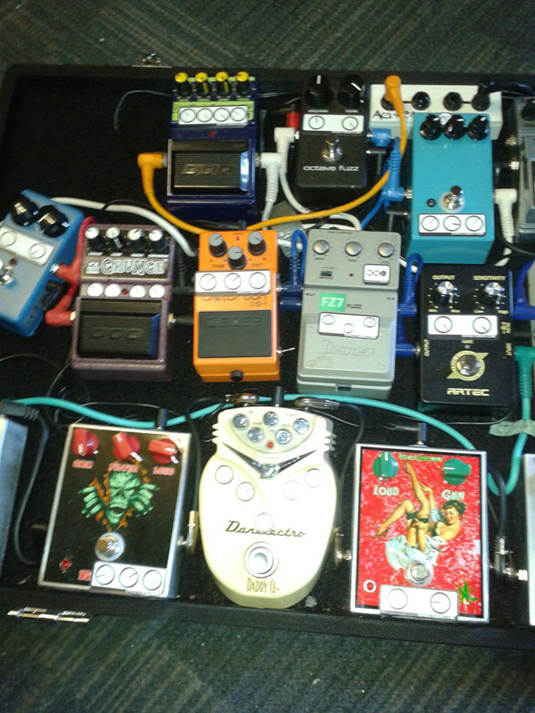 Today’s pedal line is from Richard Memczak. If you have a pedal line (doesn’t have to be in a board) for your rig, please email me a photo, bio, description of pedals and routing to pedalline@nulleffectsbay.com. Every Friday I’ll showcase a pedal line submission. Make sure you include any links to your band or music page.