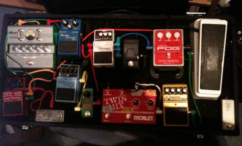 Today’s pedal line is from Tom Warland. If you have a pedal line (doesn’t have to be in a board) for your rig, please email me a photo, bio, description of pedals and routing to pedalline@nulleffectsbay.com. Every Friday I’ll showcase a pedal line submission. Make sure you include any links to your band or music page.