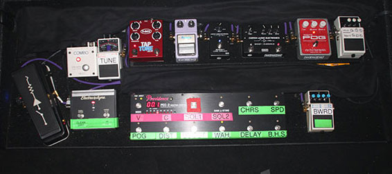 Here is a break down of pedals on Kim’s board. Also, looks like he’s using some pedal labels from PedalLabels.com!