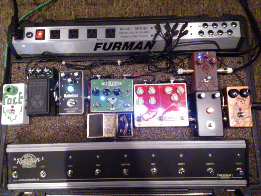 I love my Furman SPB8C power conditioning pedal board first off. It makes it very easy to keep things nice and clean and also provides clean power to anyone needing to plug into it due to lack of stage power (we all know what that can be like).