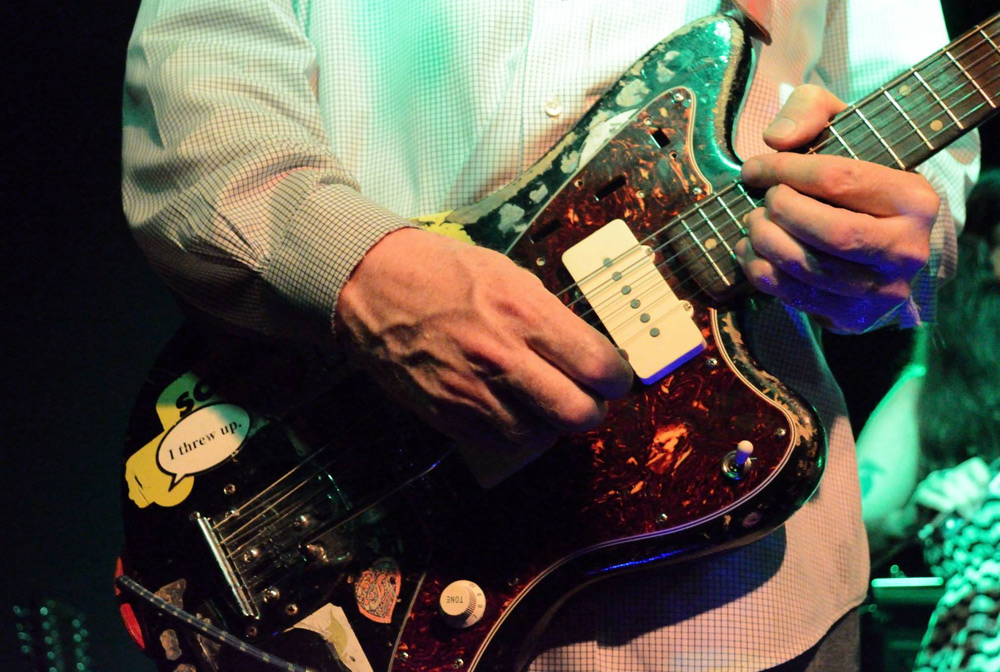 I also wanted to post this great photo of his 1960 Black Jazzmaster that was stolen 6 months later in 12/12/2012. A lot of the photos showing the stolen guitar, had the old pickguard with stickers. As you can see in this photo, this guitar has a ‘fresh’ pickguard. Same stickers on the body, but no stickers on the pickguard. Any one know if this guitar was found??