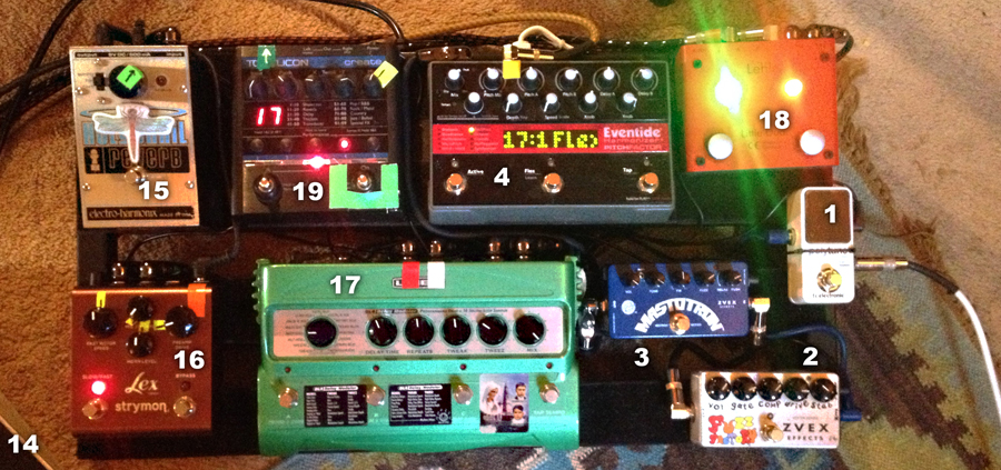 Eric– Yeah, I put the Pitchfactor there for maximum flexibility. In that position, is has a couple of fuzzes before it (to pitch-shift their harmonics to interesting effect), and a fuzz and a few overdrive after it (for a more natural pitch-shifted gain sound). Sometimes the wrongest things can be oh so right!