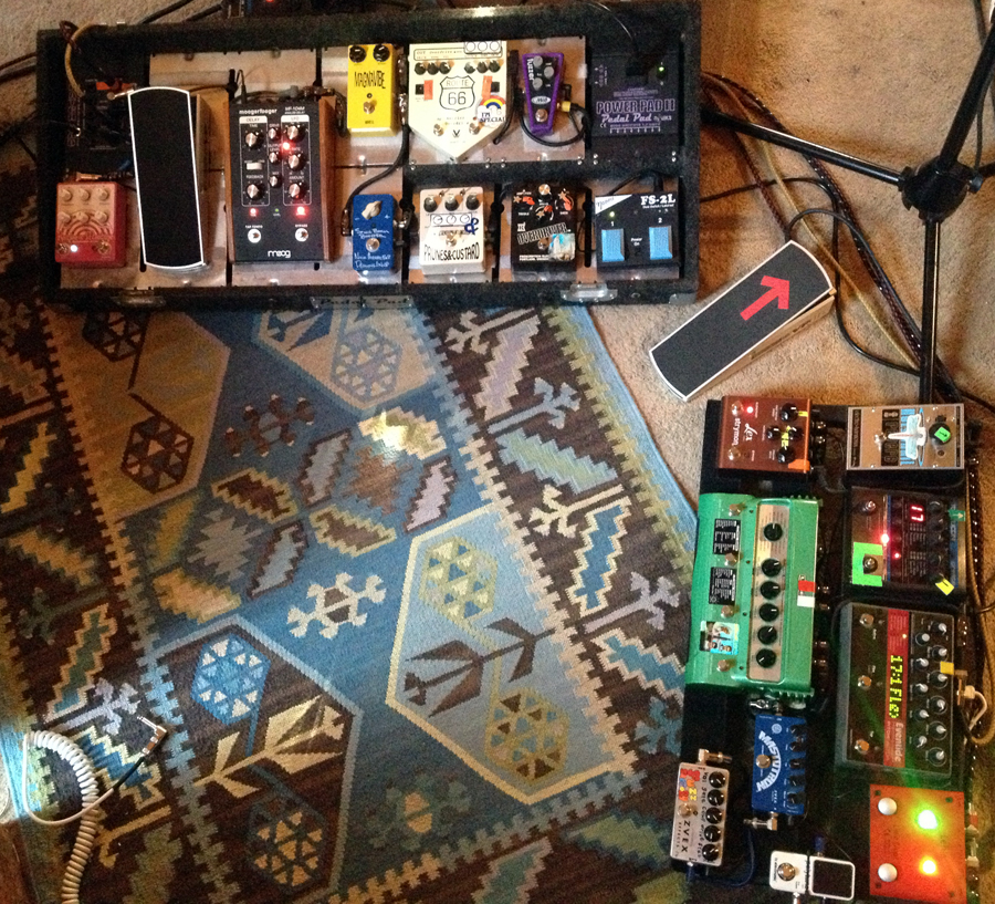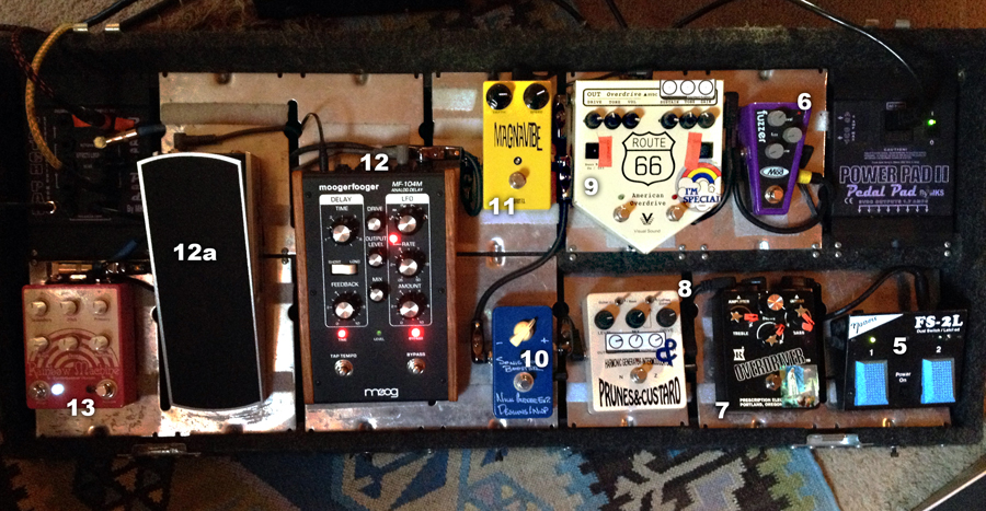 ModTone Mini-Mod Fuzzer > Prescription Electronics Overdriver > Crowther Audio Prunes & Custard > Visual Sound Route 66 Overdrive/Compression > Nick Greer Sonic Boom Boost > Bigfoot FX Magnavibe > Moog Moogerfooger MF-104M Analog Delay > Earthquaker Devices Rainbow Machine >