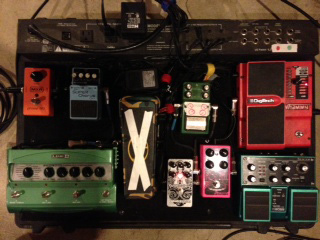 Hi my name is brent hamker and i am a big fan of your website as i myself am a big pedal enthusiast. I do a lot of gigs locally (3 or 4 weekly) and every single gig is different so i need to cover as many tones and bases as possible. For instance Thursday night i played in a jazz quartet doing standards and john Scofield esque tunes to this sunday where i played at a church service called the U2charist, a service comprised completely of U2’s music. I also play in a dance/rock band in Cleveland, OH called pOUT ( facebook.com/poutband , www.poutband.com), a reggae dancehall band called The Champion Bubblers, the Ernie Krivda Jazz Workshop, as well as my own straight ahead jazz groups and who ever else will call me, So i built this pedal board to be the guitarists swiss army knife of tone.