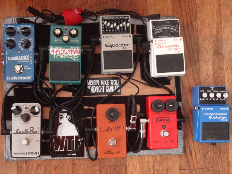 Hello! I’m “Misisipi Mike Wolf”, a singer/songwriter and outlaw/honky tonk band leader originally from Mississippi but currently based in Northern California. I average around 170 live shows a year, about half of those being showcase gigs with mostly original material and the other half being multi-set bar band gigs (lots of ’60’s Bakersfield and 70’s Outlaw stuff). Â I need my board to have the typical color palate for that genre and also I need it to be compact enough to fit on postage stamp size stages as well as light enough to carry with an amp and guitar in one trip from the vehicle. Â Oh, and as a full time working musician I am on a tight budget, so I am always looking for maximum bang for the buck.