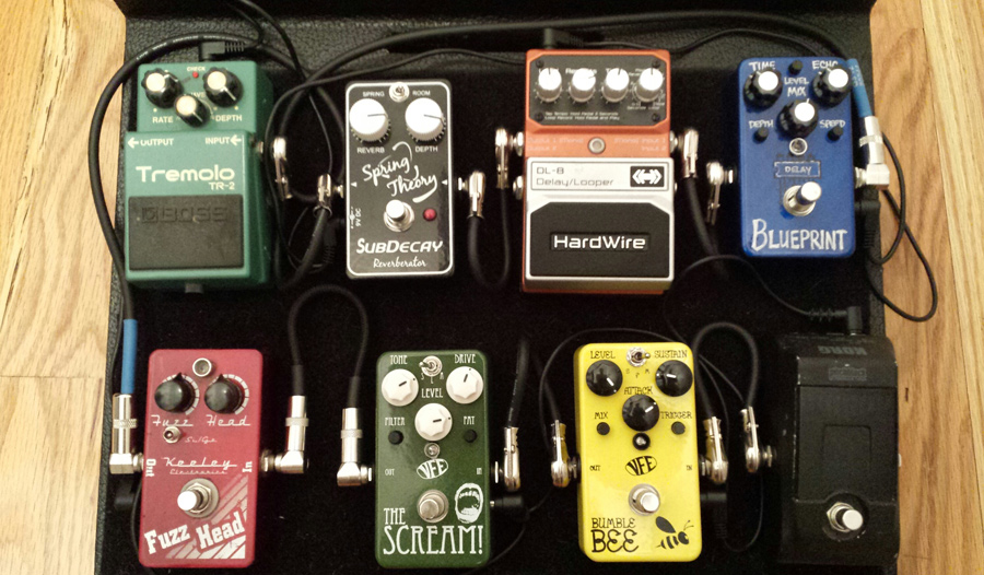 I wanted to send in the board I use for my band, Violet Machine. We’re an indie rock/post-punk band out of Brooklyn, NY. I mainly play rhythm, but also do a main riff or a run once in a while. This is the current iteration of my board. I try to keep it as small as possible.