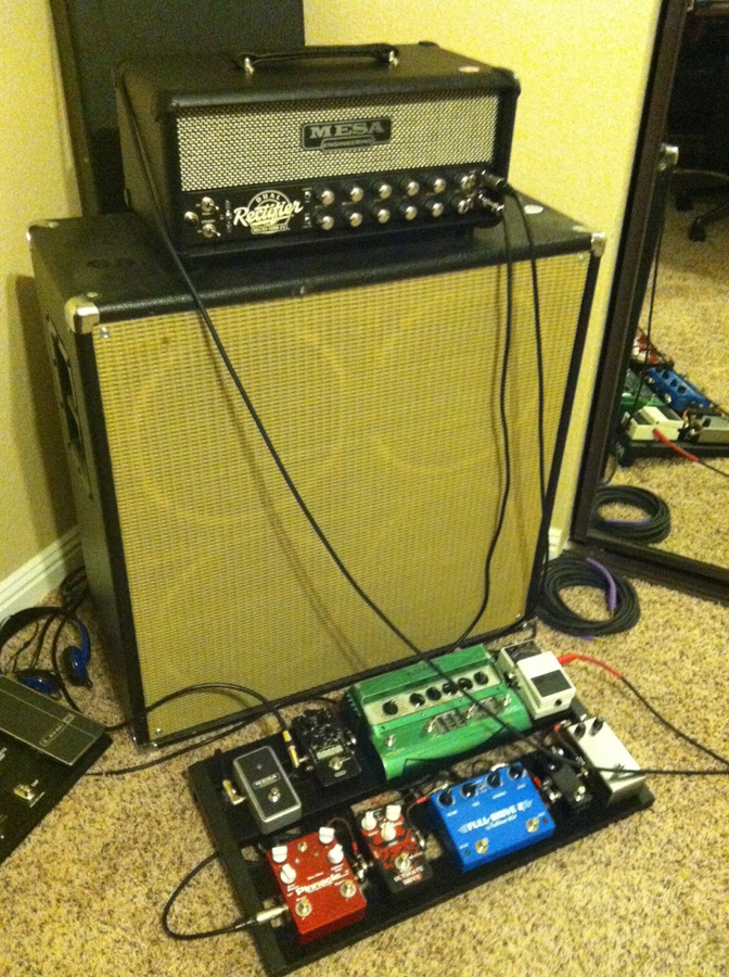 All of these are hooked up with Evidence Audio Monorail cable and pancake plugs that I soldered myself…another fun DIY project I highly recommend. Custom cable lengths keep everything nice and tidy. I’m strictly a bedroom player these days and its all going in to the new Mesa Rectoverb 25 head, then into an Avatar 4×12 w/ their Hellatone 30 speakers (Celestion G12H30). One or both channels can be switched down to 10W mode which may just keep me from being evicted! I’m seriously diggin’ my rig these days.