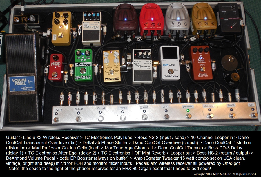 Guitar > Line 6 X2 Wireless Receiver > TC Electronic Polytune > Boss NS-2 (input / send) > 10 Channel Looper in > Dano CoolCat Transparent Overdrive (dirt) > DeltaLab Phase Shifter > Dano CoolCat Overdrive (crunch) > Dano CoolCat Distortion (distortion) > Mad Professor Golden Cello (lead) > ModTone AquaChorus II > Dano CoolCat Tremolo > Boss DD-3 Delay (delay 1) > TC Electronics Alter Ego (delay 2) > TC Electronics HOF Mini Reverb > Looper Out > Boss NS-2 (return / output) > DeArmond Volume Pedal > xotic EP Booster (always on buffer) > Amp (Egnater Tweaker 15 watt combo set on USA clean, vintage, bright and deep) mid’d for FOH and monitor mixer inputs. Pedals and wireless receiver all powered by OneSpot. Note: the space to the right of the phaser reserved for an EHX B9 Organ pedal that I hope to add soon!