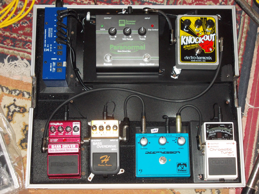 Hi, my name is Giacomo,I write from Italy, I use these pedals: Boss Tuner TU3, Palmer Deepressor pedal that is a strong bass compressor and it has the pad button for switching between active and passive bass pickups, Harley Benton Bass Overdrive BOD-1, Digitech Bass Drive, Electro-Harmonix Knockout pedal for pumping the attack and for the last one Seymour Duncan SFX-06 Paranormal Bass DI box with equalizer, very powerful pedal that has balanced output and unbalanced output in the same time.