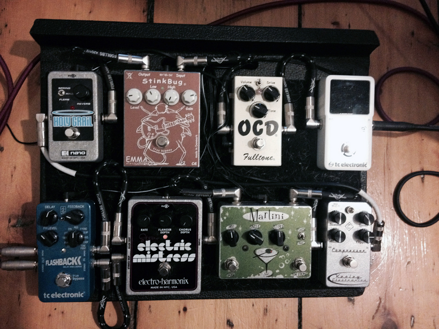 My pedals consist of 3 Danes and 5 Americans (I am a Dane residing in Brooklyn, NY) Anyway, from top right to left TC PolyTune, Fulltone OCD, Emma Stinkbug, Electro-Harmonix Holy Grail Nano and from there to the bottom row right to left Keeley 4 knob comp, Tortuga Martini, Electro-Harmonix Electric Mistress and finally the TC Flashback. I have gotten quite a bit of grief for placing the Holy Grail reverb before the Keeley compressor but I am a huge fan of Daniel Lanois’ guitar sound and experimenting with placement led me to trying this out and I absolutely love that ducked reverb that just seems to expand forever!