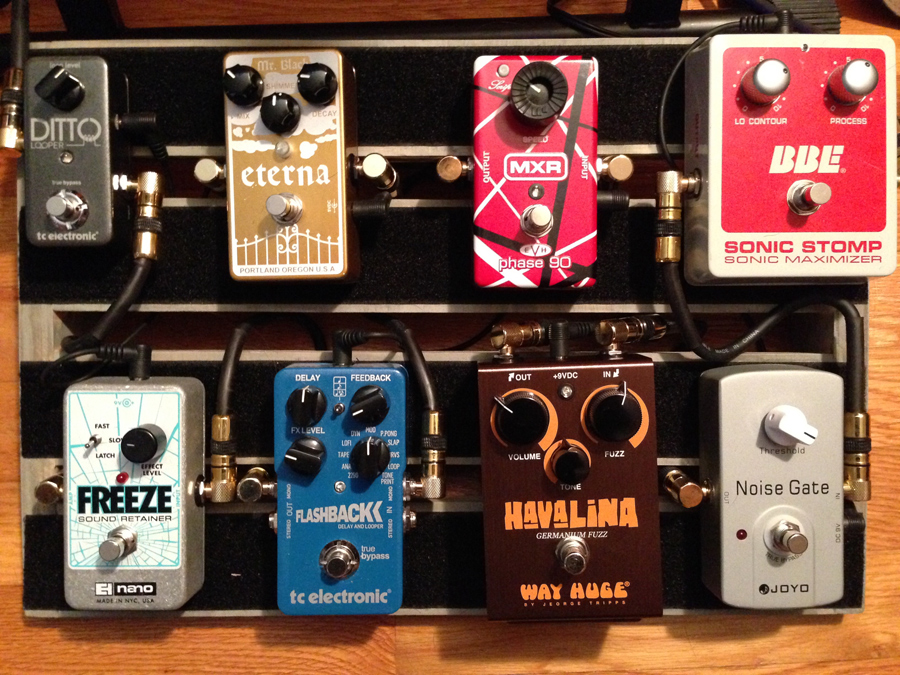 I find after some experimentation that this is the most effective and best sounding means to run these pedals for me. The reason I like my effects pedals are: The BBE sonic stop just makes everything sound better! It seems that no one can really say why this is but honestly the sonic stop just improves note clarity, and definition of whatever I play. The Joyo noise gate stops any amp hum when I use the high gain channel on my amp. The Havelina fuzz is the best sounding, creamiest fuzz I have ever heard. It’s not Buzzy like some. The MXR eVh phase 90 is just a beautiful sweeping but controllable phaser that plays nice with other pedals! Mr. Black’s Eterna Gold reverb pedal is simply amazing! The shimmer knob lets you dial in some crazy-good “choir from the Heavens” effect which is quite mesmerizing & beautiful when I play through my amp’s clean channel. The TC electronic flashback delay has every kind of delay sound that anyone could want. I prefer the tape delay or mod delay setting. The electro harmonic’s Freeze nano is perfect when I want to freeze a note or chord I’ve just played and hold it and definitely while I play lead over that held chord or note! It gets me creative really quickly! The TC electronic ditto looper is an easy to use looping pedal that does what it’s supposed to very simply. Loop!