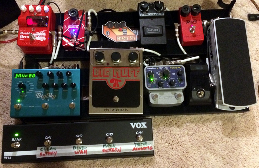 9) VOX Double Deca DelayPlaying into a VOX VT20 amp with the VFSS Bank footswitch capable of using amp presets. The board is a PedalTrain 2 with VooDoo Lab power unit mounted to the underneath.
