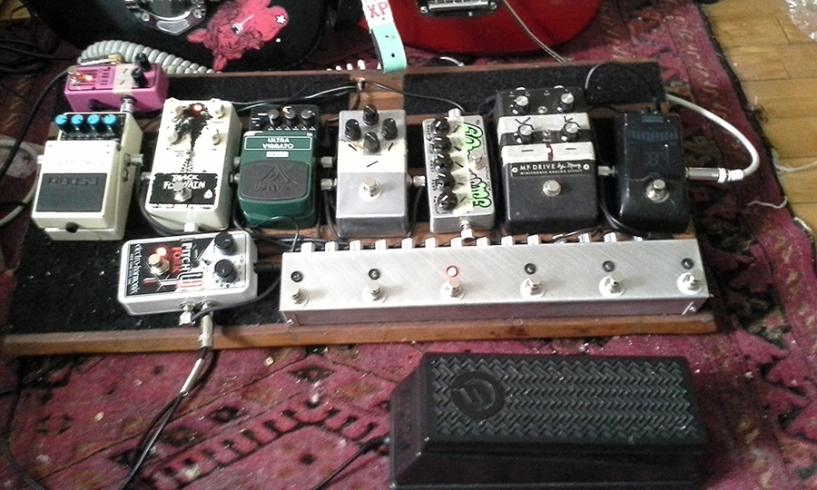 Today’s Pedal Line Friday submission is from Julien-Pier Belanger. If you have a pedal line (doesn’t have to be in a board) for your rig, please email me a photo, bio, description of pedals and routing to pedalline@nulleffectsbay.com. Every Friday I’ll showcase a pedal line submission. Make sure you include any links to your band or music page.