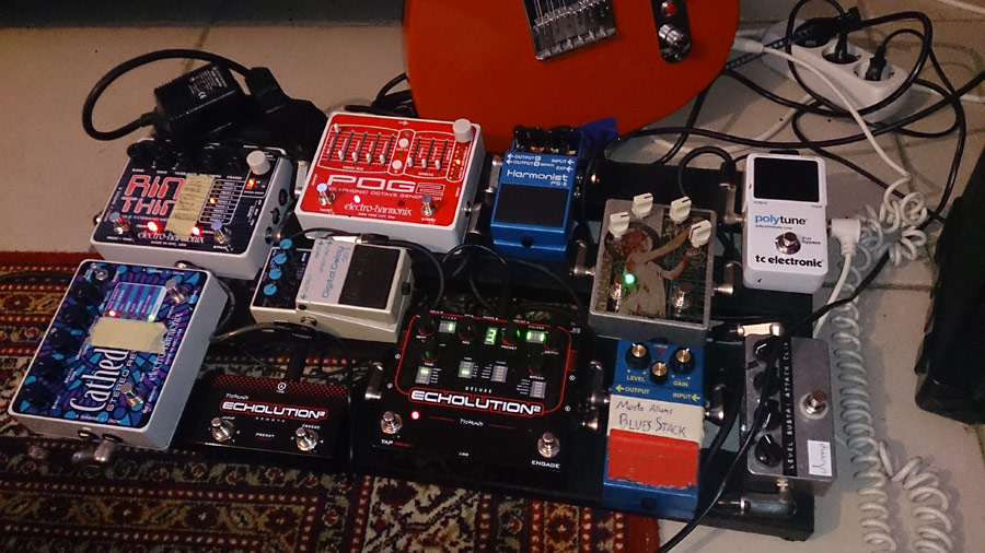 Following is the ehx Pog2 I use to differentiate my guitar sound from the other 2 guitars, if it’s needed. Mainly, I use a preset with just one octave up an a bit of +2, to give it that typical Pog2 steeldrum sound. Also organ sounds for layers in the background.