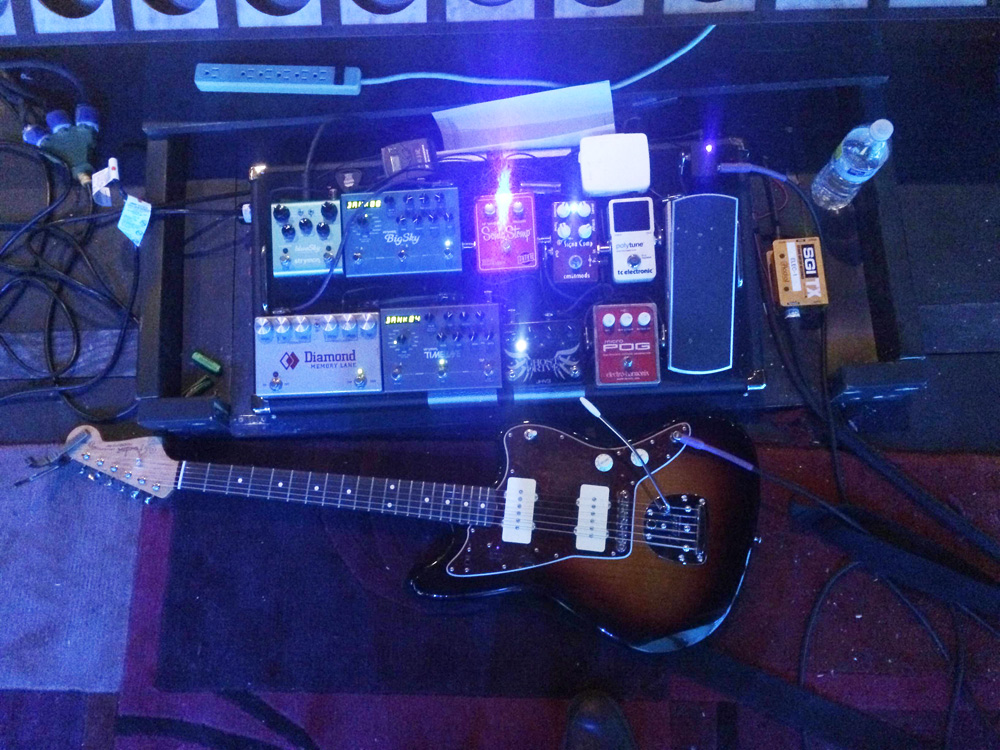 Today’s Pedal Line Friday submission is from Jesse Davidson. If you have a pedal line (doesn’t have to be in a board) for your rig, please email me a photo, bio, description of pedals and routing to pedalline@nulleffectsbay.com. Every Friday I’ll showcase a pedal line submission. Make sure you include any links to your band or music page.