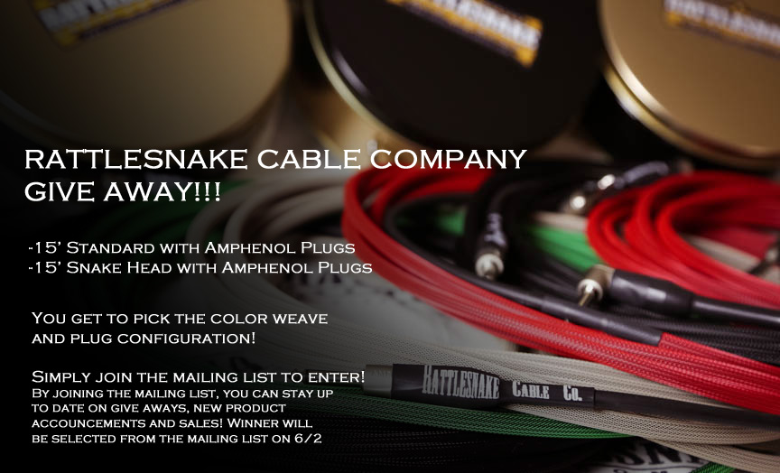 I wanted to post this really simple / easy give away! My other venture Rattlesnake Cable Company is having a nice little give away where you can walk away with a 15′ Snake Head and 15′ Standard cable – your choice on plug configuration, and your choice on color! That’s a $120 regular price value. All you need to do – is to sign up to the mailing list!